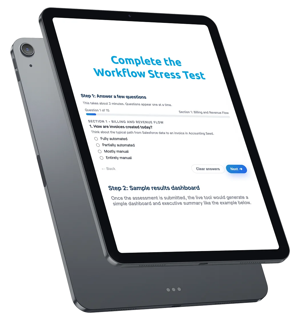 The Workflow Stress Test is useful for finance teams who feel their Salesforce and Accounting Seed process is harder than it should be. If you rely on imports or journal entries, if approvals slow things down, or if month-end shifts from cycle to cycle, the test will show whether these issues point to real workflow strain. It also helps when too much of the process lives in the heads of a few key people.